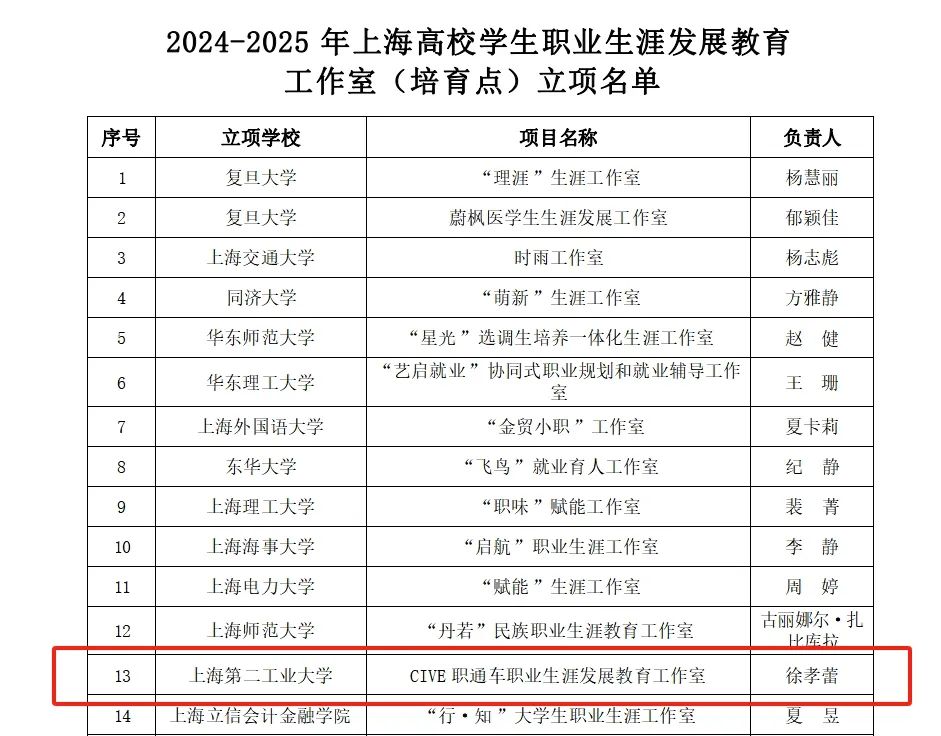 近日,上海市教育委员会公布了2024-2025年上海高校毕业生就业创业工作基地、大学生职业生涯指导和服务体系建设项目评审结果,高等职业技术(国际)学院申报的“CIVE职通车职业生涯发展教育工作室”获2024-2025年上海高校学生职业生涯发展教育工作室(培育点)立项。