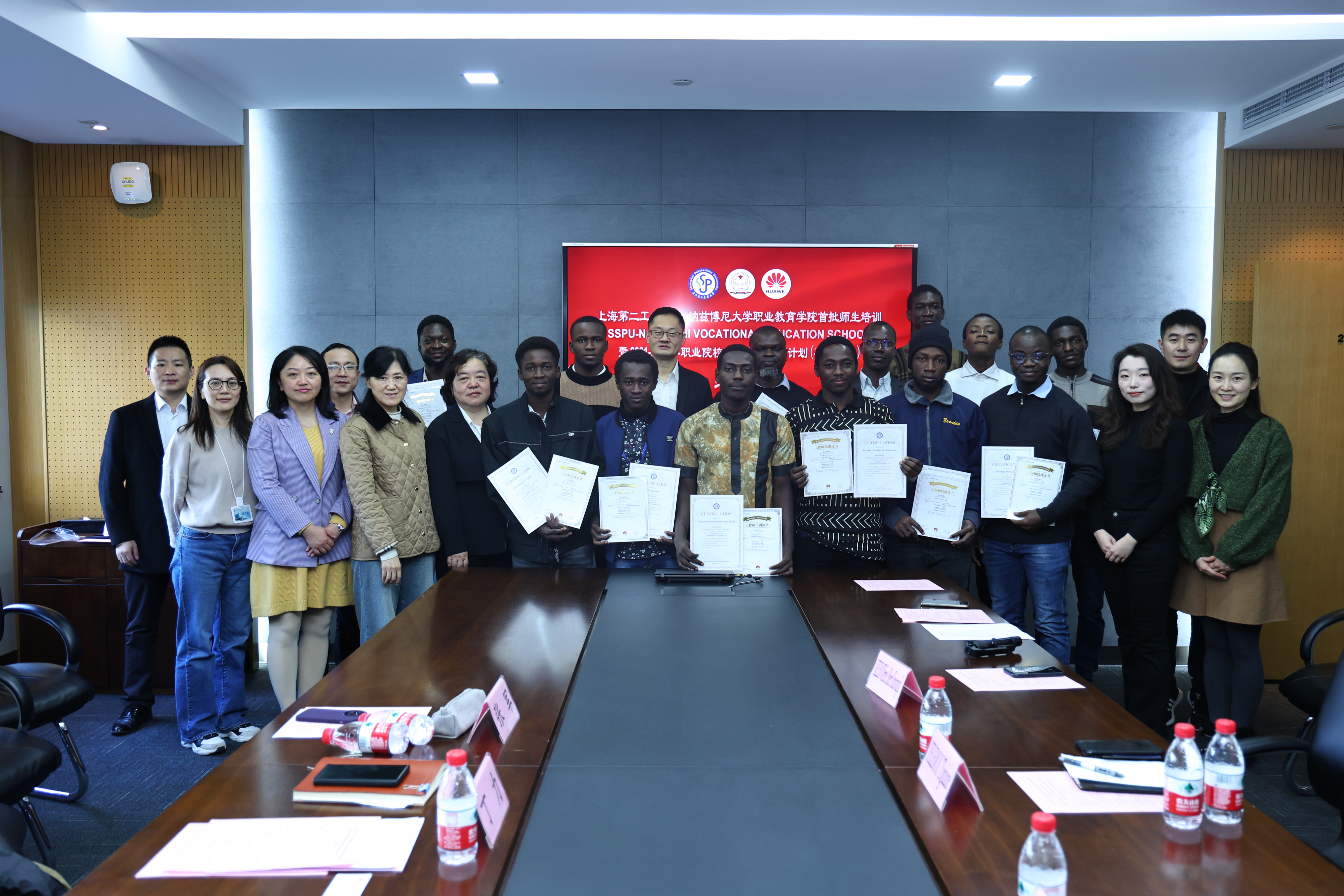 12 月1 4 日,上海第二工业大学-纳兹博尼大学职业教育学院首批师生培训结业仪式在19号楼207会议室举行。副校长丁力、华为上海院校人才培养中心代表赵慧迪、袁玉强及来自布基纳法索纳兹博尼大学的师生参加结业仪式。会议由高等职业技术(国际)学院院长、职业技术教师教育学院执行院长张军主持。